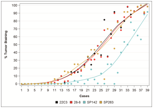 從階段Ⅰ的數(shù)據(jù)來看,四種檢測方法中,28-8、22C3和SP263在腫瘤染色方面一致性較好,唯有SP142是個例外;在四種方法中,免疫細(xì)胞上PD-L1的表達(dá)較之腫瘤細(xì)胞上的表達(dá)差異性更大(參見圖1和2);依然有36.9%的病例表現(xiàn)出不一致的結(jié)果。免疫組化依然作為檢測PD-L1蛋白表達(dá)的金標(biāo)準(zhǔn),鼓勵使用陽性/陰性來定義PD-L1的表達(dá),但可能會朝向定義更加多元化的判定來替代單一的Cutoff值。
