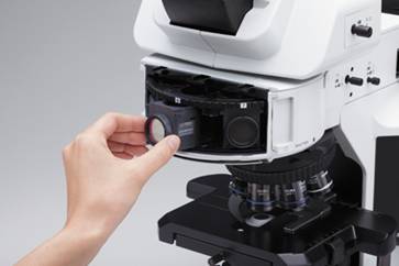 以常見的奧林巴斯BX53顯微鏡為例(其他品牌也差不多),它的濾光單元長這樣: