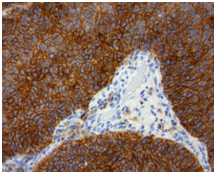 PD-L1抗體在人肺癌中的染色。腫瘤細(xì)胞呈強(qiáng)的細(xì)胞膜染色。